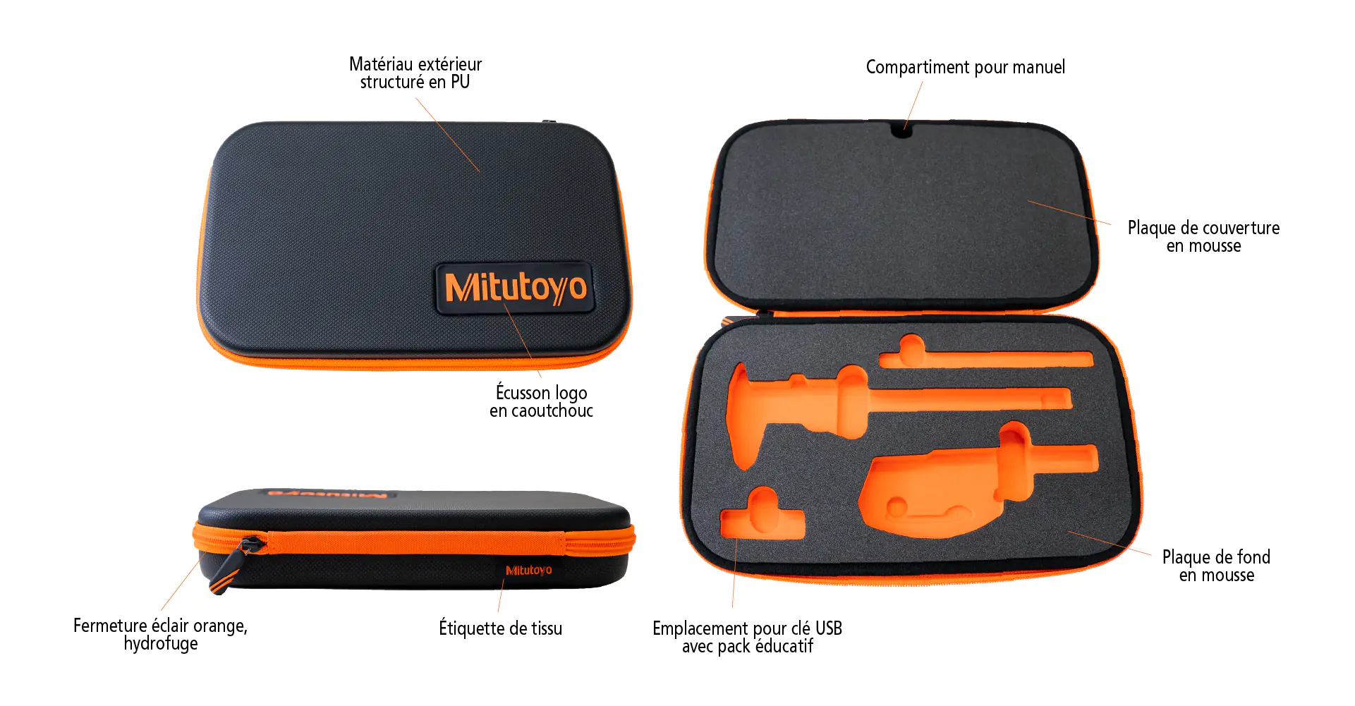 La boîte est incluse dans le set pour apprenti Mitutoyo et assure un rangement sûr et clair des instruments de mesure qu'elle contient.